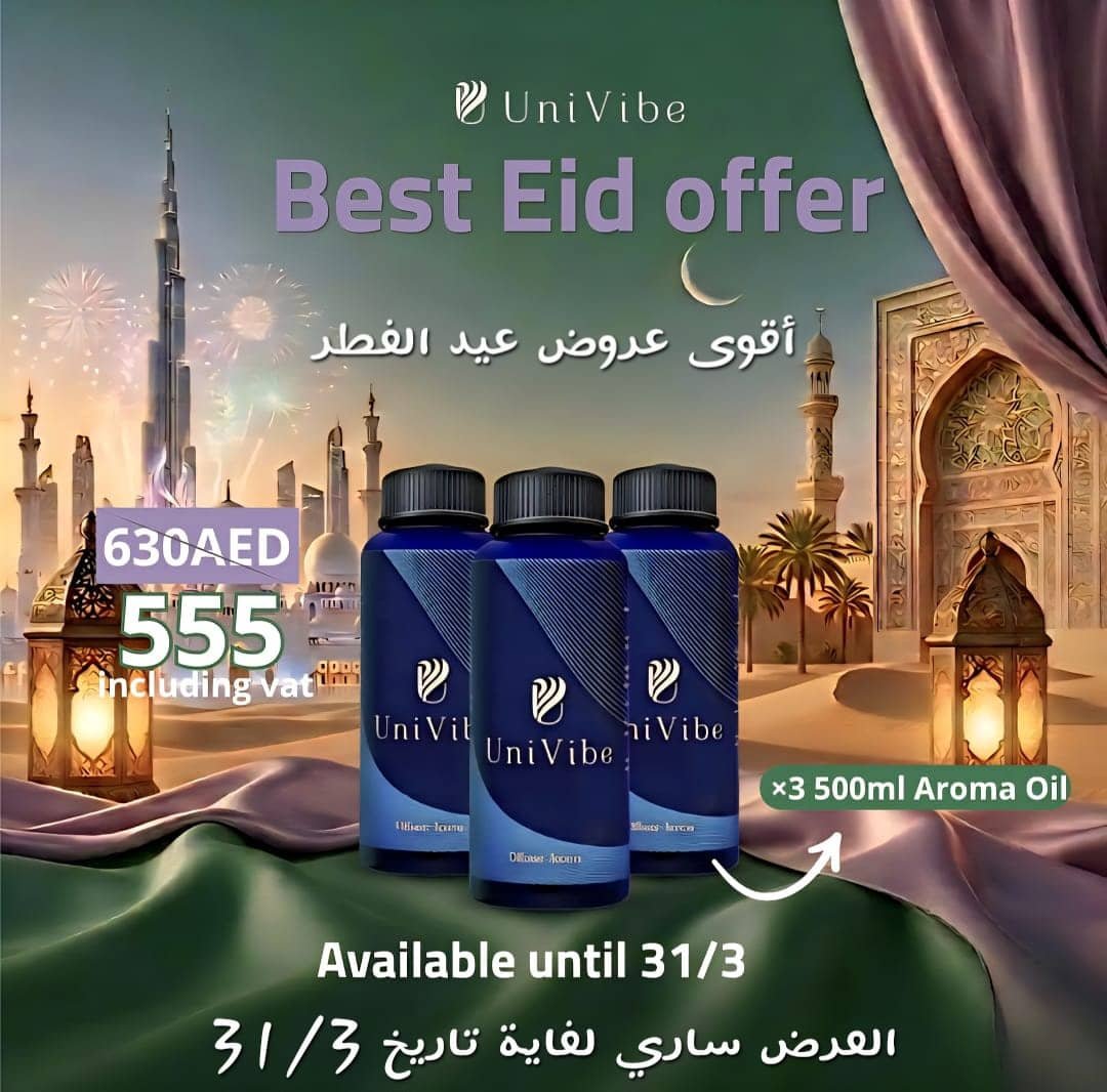 Celebrate the spirit of Eid with UniVibe’s exclusive 3-piece aroma oil 500 ml bundle. A perfect blend of elegance, freshness, and calm — crafted for your home, office, or as a thoughtful Eid gift.
